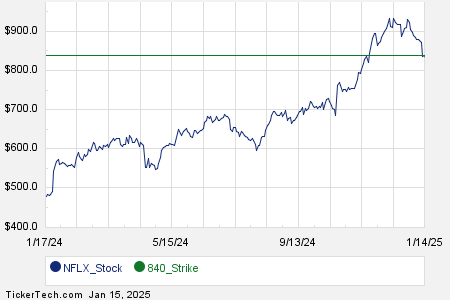 Below is a chart showing the trailing twelve month trading history for Netflix Inc, and highlighting in green where the $840.00 strike is located relative to that history: