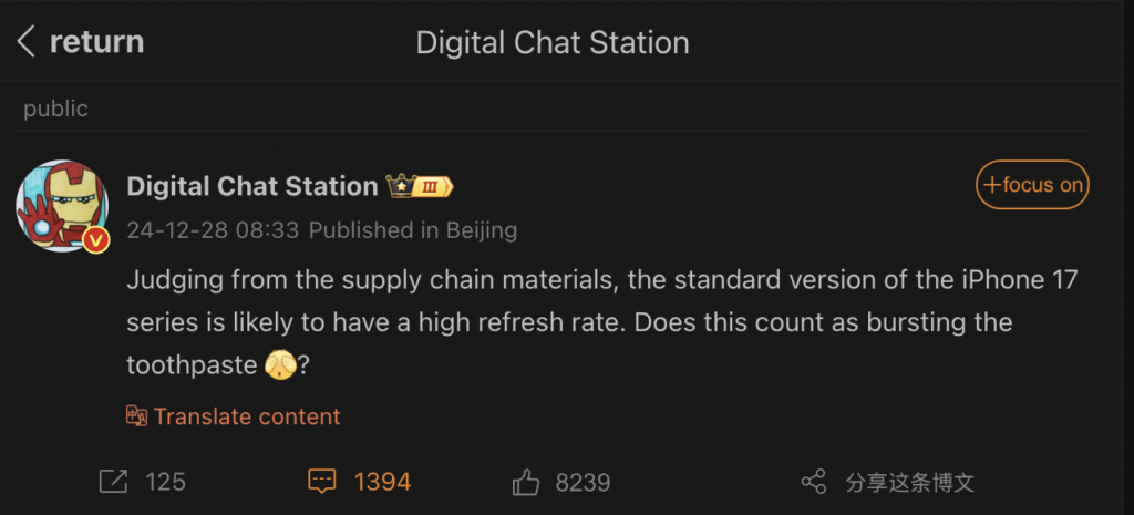 What Happened: Over the weekend, Weibo-based Chinese leaker Digital Chat Station said that supply chain materials support the rumors of a higher refresh rate for the standard iPhone 17.