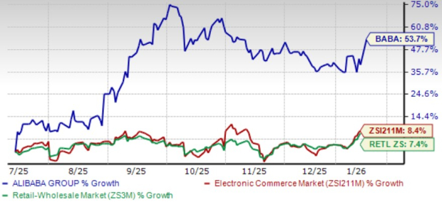 BABA shares have rallied 53.7% in the past six-month period, outperforming the Zacks Internet – Commerce industry and the Zacks Retail-Wholesale sector’s growth of 8.4% and 7.4%, respectively.