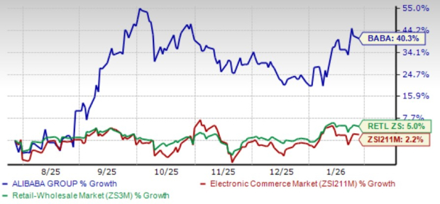 BABA shares have gained 40.3% in the past six-month period, outperforming the Zacks Internet – Commerce industry and the Zacks Retail-Wholesale sector’s growth of 2.2% and 5%, respectively.