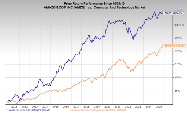 Amazon stock has surged 2,600% over the past 15 years, outpacing Tech’s 710% and Microsoft’s 1,900%.