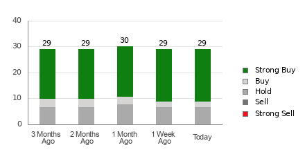 Disney currently has an average brokerage recommendation (ABR) of 1.53, on a scale of 1 to 5 (Strong Buy to Strong Sell), calculated based on the actual recommendations (Buy, Hold, Sell, etc.) made by 29 brokerage firms. An ABR of 1.53 approximates between Strong Buy and Buy.