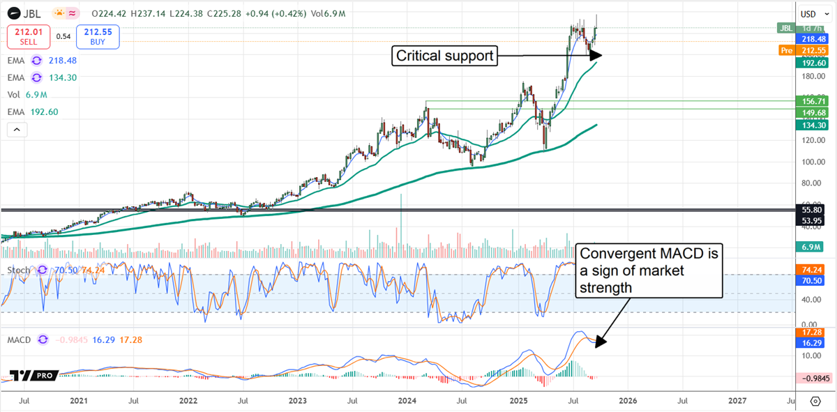 JBL’s stock price pulled back following the guidance update, opening a classic buy-the-dip opportunity. The move has the market down by 5% but is still well above critical support at the bottom of the near-term trading range.