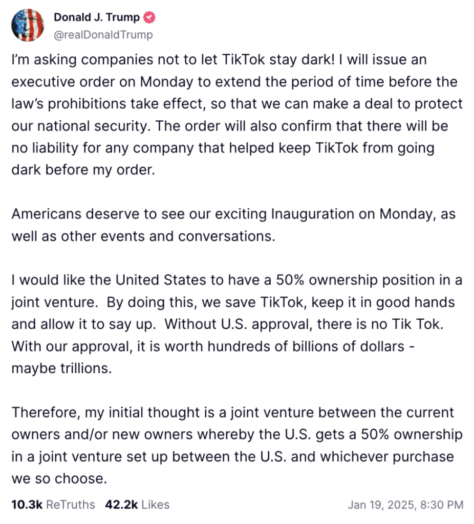 TikTok, which went dark for some time later Saturday started restorning its services on Sunday. Donald Trump “most likely” plans to extend TikTok’s deadline by 90 days to facilitate a deal.