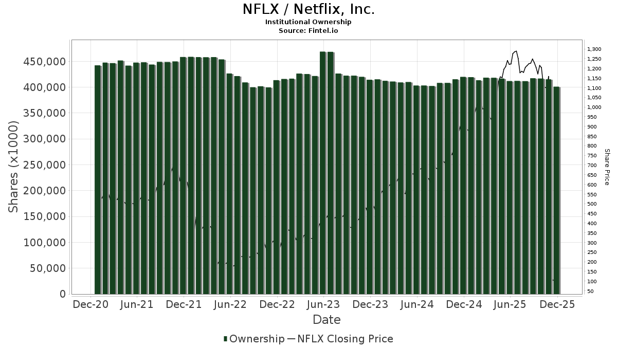 There are 2985 funds or institutions reporting positions in Netflix. This is an increase of 146 owner(s) or 5.14% in the last quarter. Average portfolio weight of all funds dedicated to NFLX is 0.64%, an increase of 8.05%. Total shares owned by institutions increased in the last three months by 2.69% to 426,776K shares.