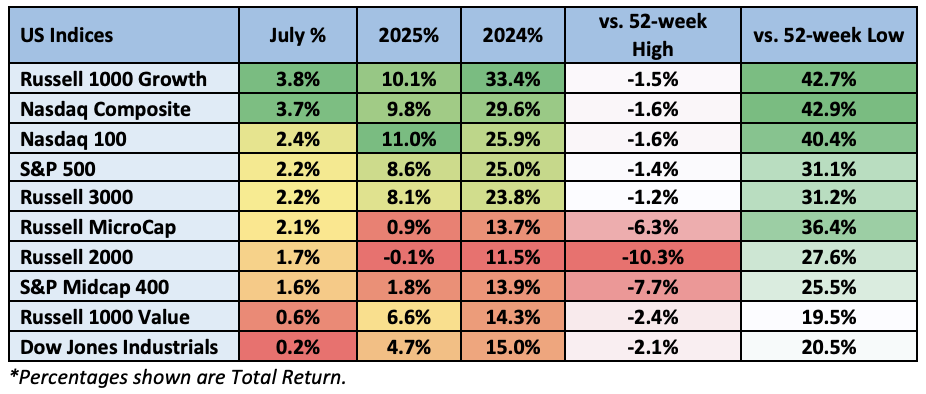 Index performance for July: