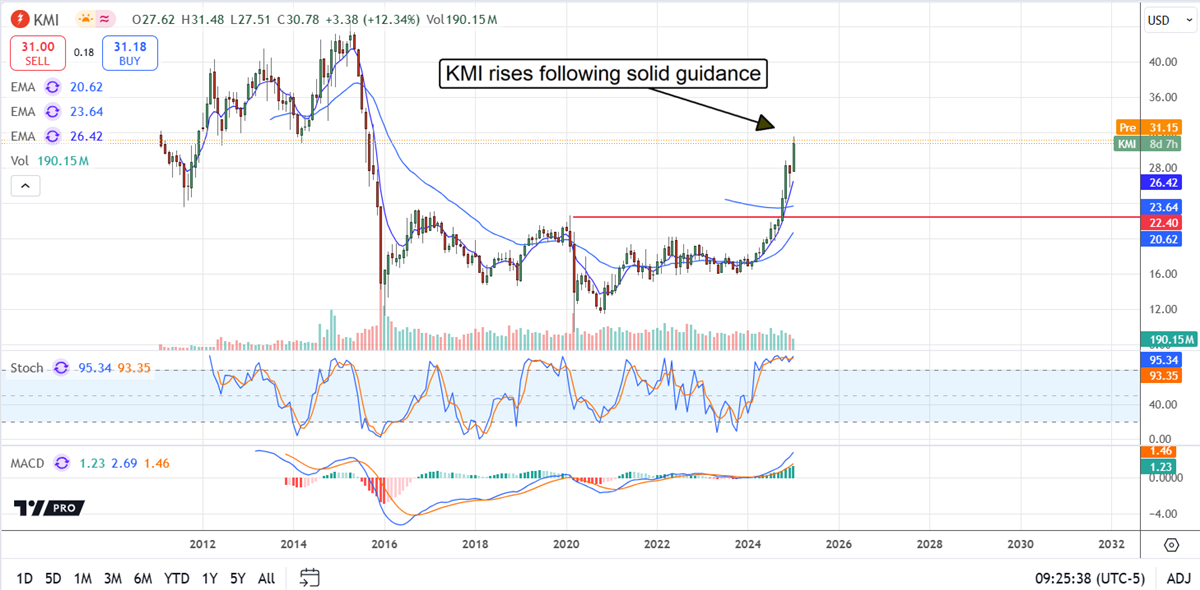 The technical action in KMI stock is robust. The market is up 100% from its lows and looks strong in early 2025. The action at the end of 2024 and early 2025 amounts to a consolidation and continuation signal that could result in a $12 move from the breakout point. That gives a target of $40, which is near record high levels.