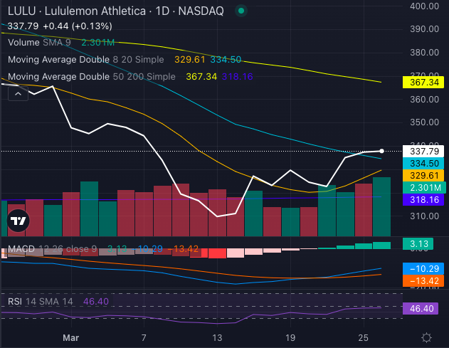 LULU stock, at $337.79 has climbed above its eight-day simple moving average of $329.61 and its 20-day simple moving average of $334.50—both bullish indicators. Additionally, trading above its 200-day simple moving average of $318.16 suggests that Lululemon still holds a long-term uptrend despite short-term weakness.
