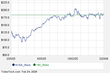 Below is a chart showing the trailing twelve month trading history for NVIDIA Corp, and highlighting in green where the $185.00 strike is located relative to that history: