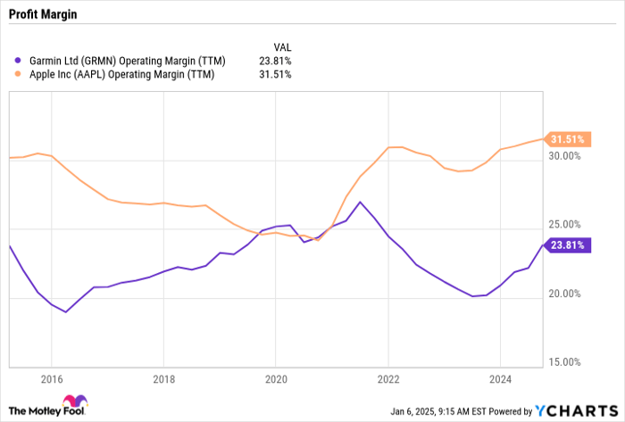 Those targets mean Garmin stock is valued at a pricey 30 times expected earnings as of early 2025. That’s not far from what you could own Apple for today. For Garmin to continue generating market-thumping returns, then, investors will need to see another year of strong sales growth and above 20% operating profit margin. Those are ambitious goals, but Garmin has demonstrated over the past decade that it can consistently win in some competitive niches like smartwatches and fitness trackers.