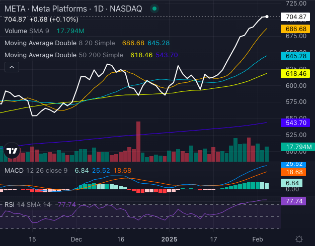 META’s bullish momentum remains intact. The stock is well above its short and long-term moving averages, with an eight-day SMA at $686.68 and a 200-day SMA way down at $543.70. As long as META stock holds above key technical levels, the rally may have more room to run.