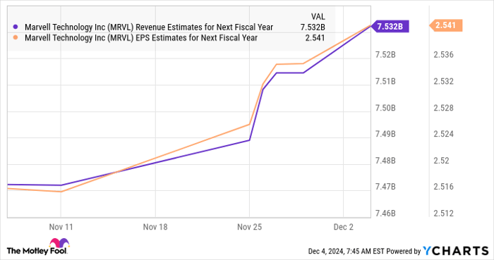 Additionally, the chipmaker expects earnings to land at $0.59 per share in the current quarter, which would translate into a 28% increase from the same period last year. Marvell CEO Matt Murphy pointed out on the latest earnings conference call that the stronger-than-expected demand for its custom AI processors played a central role in its better-than-expected performance and robust guidance.
