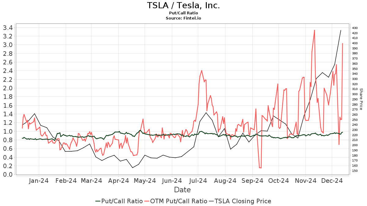 The put/call ratio of TSLA is 1.00, indicating a bearish outlook.