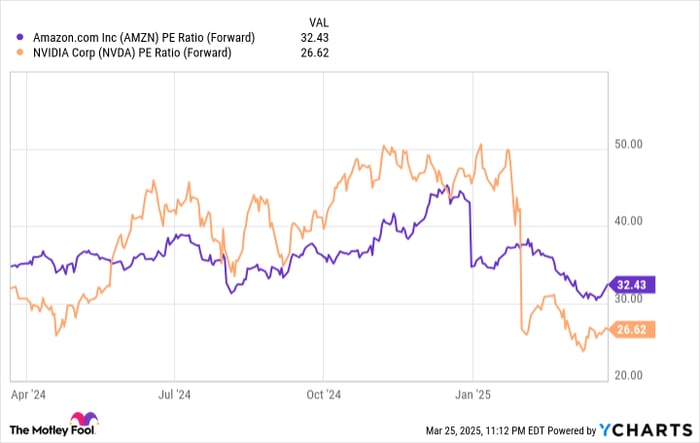 Looking at the forward price-to-earnings (P/E) ratios of Amazon and Nvidia, the latter stock has an edge. Nvidia’s forward P/E is 26.6 compared to Amazon’s 32.4.