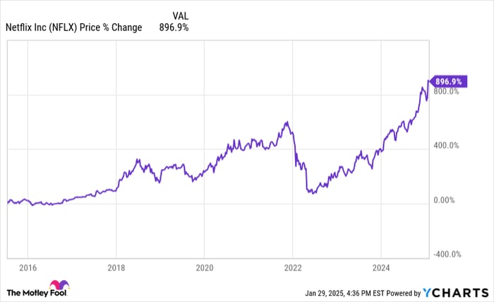 Earnings per share (EPS) — the key driver of stock returns over the long haul — have grown 3,550% in the last 10 years and reached $19.83 in 2024. Compared to a share price of almost $990 as of this writing, Netflix’s price-to-earnings ratio (P/E) is currently 50. Investors are paying a premium for the leadership and growth at Netflix, which is not surprising given its impressive track record.