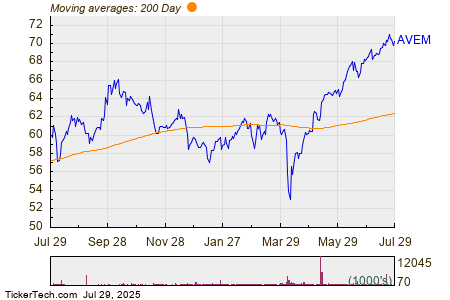 The chart below shows the one year price performance of AVEM, versus its 200 day moving average: