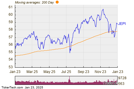 Looking at the chart above, JEPI’s low point in its 52 week range is $54.77 per share, with $60.88 as the 52 week high point — that compares with a last trade of $58.81. Comparing the most recent share price to the 200 day moving average can also be a useful technical analysis technique — learn more about the 200 day moving average ».