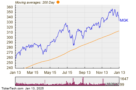The chart below shows the one year price performance of MGK, versus its 200 day moving average: