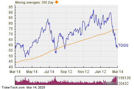Looking at the chart above, TQQQ’s low point in its 52 week range is $48.80 per share, with $93.7892 as the 52 week high point — that compares with a last trade of $59.91. Comparing the most recent share price to the 200 day moving average can also be a useful technical analysis technique — learn more about the 200 day moving average ».
