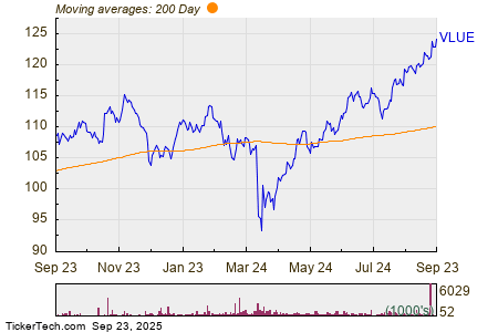 Looking at the chart above, VLUE’s low point in its 52 week range is $91.80 per share, with $124.61 as the 52 week high point — that compares with a last trade of $124.31. Comparing the most recent share price to the 200 day moving average can also be a useful technical analysis technique — learn more about the 200 day moving average ».