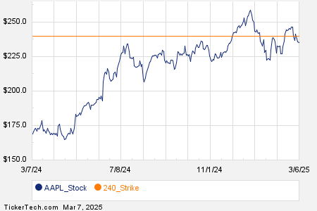 Among the underlying components of the S&P 500 index, we saw noteworthy options trading volume today in Apple Inc (Symbol: AAPL), where a total of 616,762 contracts have traded so far, representing approximately 61.7 million underlying shares. That amounts to about 137.4% of AAPL’s average daily trading volume over the past month of 44.9 million shares. Especially high volume was seen for the $240 strike call option expiring March 07, 2025, with 56,420 contracts trading so far today, representing approximately 5.6 million underlying shares of AAPL. Below is a chart showing AAPL’s trailing twelve month trading history, with the $240 strike highlighted in orange: