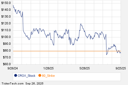 Looking at options trading activity among components of the Russell 3000 index, there is noteworthy activity today in Crocs Inc (Symbol: CROX), where a total volume of 35,529 contracts has been traded thus far today, a contract volume which is representative of approximately 3.6 million underlying shares (given that every 1 contract represents 100 underlying shares). That number works out to 170.8% of CROX’s average daily trading volume over the past month, of 2.1 million shares. Particularly high volume was seen for the $80 strike call option expiring September 26, 2025, with 4,863 contracts trading so far today, representing approximately 486,300 underlying shares of CROX. Below is a chart showing CROX’s trailing twelve month trading history, with the $80 strike highlighted in orange: