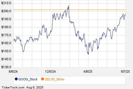 Looking at options trading activity among components of the S&P 500 index, there is noteworthy activity today in Alphabet Inc (Symbol: GOOG), where a total volume of 306,329 contracts has been traded thus far today, a contract volume which is representative of approximately 30.6 million underlying shares (given that every 1 contract represents 100 underlying shares). That number works out to 124% of GOOG’s average daily trading volume over the past month, of 24.7 million shares. Especially high volume was seen for the $202.50 strike call option expiring August 08, 2025, with 27,841 contracts trading so far today, representing approximately 2.8 million underlying shares of GOOG. Below is a chart showing GOOG’s trailing twelve month trading history, with the $202.50 strike highlighted in orange:
