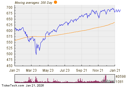 Looking at the chart above, IVV’s low point in its 52 week range is $484 per share, with $699.17 as the 52 week high point — that compares with a last trade of $685.68. Comparing the most recent share price to the 200 day moving average can also be a useful technical analysis technique — learn more about the 200 day moving average ».