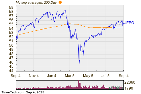Looking at the chart above, JEPQ’s low point in its 52 week range is $44.311 per share, with $58.54 as the 52 week high point — that compares with a last trade of $55.33. Comparing the most recent share price to the 200 day moving average can also be a useful technical analysis technique — learn more about the 200 day moving average ».