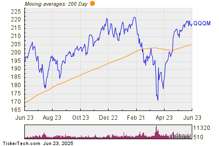 The chart below shows the one year price performance of QQQM, versus its 200 day moving average: