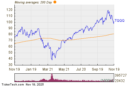 Looking at the chart above, TQQQ’s low point in its 52 week range is $35 per share, with $121.37 as the 52 week high point — that compares with a last trade of $102.83. Comparing the most recent share price to the 200 day moving average can also be a useful technical analysis technique — learn more about the 200 day moving average ».