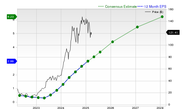 In the case of Nvidia, the consensus sales estimate of $43.22 billion for the current quarter points to a year-over-year change of +65.9%. The $198.36 billion and $243.2 billion estimates for the current and next fiscal years indicate changes of +52% and +22.6%, respectively.