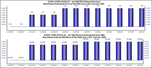 As shown below, both earnings and revenue estimates for the quarter to be reported have been positive since late November of 2025, reflecting implied growth rates of 70% and 67%, respectively.