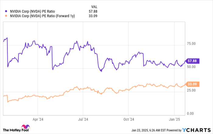 Because Nvidia is expected to grow so much over the next year, using a trailing earnings metric can be problematic. So, I’ll use a forward-looking measure to assess Nvidia’s valuation.