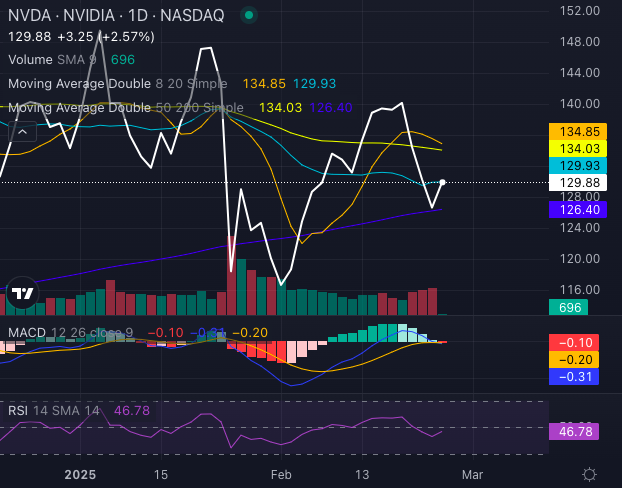 However, some technical indicators hint at potential stabilization. Nvidia’s 200-day simple moving average at $126.40 signals long-term support, though its Moving Average Convergence Divergence (MACD) indicator at a negative 0.31 supports the bearish signals. With a Relative Strength Index (RSI) of 46.78, the stock trades in the neutral territory but has yet to reach a critical reversal zone.