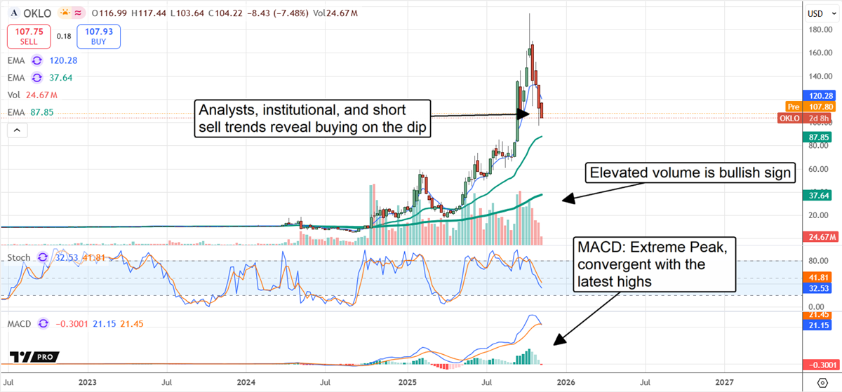 Oklo stock chart showing pullback with bullish volume and MACD signals.