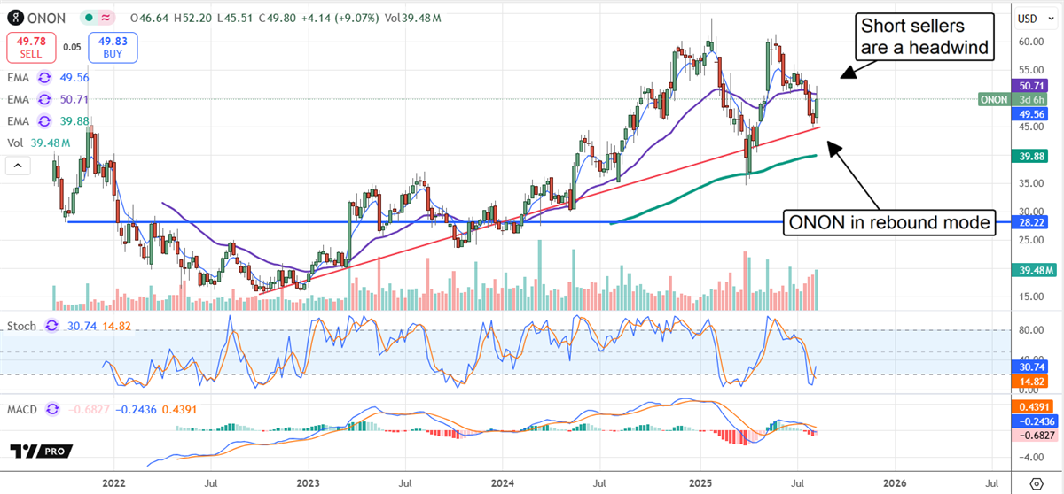 Technically speaking, On Holdings’ stock price is in an uptrend, and the post-release action in August confirmed it. The stock advanced approximately 10% in premarket trading, holding the gains into the open session, rebounding from recent lows and the uptrend line, with volume rising in support of the move.