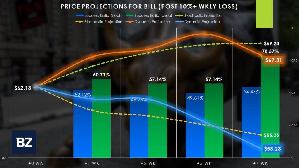 Even more enticing, rather than viewing the data from a simple stochastic or temporal framework, one can filter the data through a dynamic lens. Last week, BILL stock dropped 33.83% — an extreme-fear event if there ever was one. Whenever BILL has lost 10% or more in a one-week period (in the past five years), there’s a 60.71% chance that it will rise one week later. Over four weeks, the long odds soar to 78.57%.
