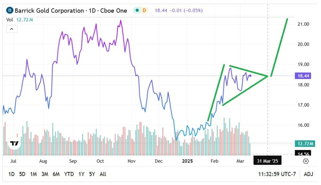 Perhaps the most compelling argument for future upside in GOLD stock isn’t in the fundamental narrative but rather the technical. At this juncture, the equity appears to be charting a bullish pennant formation.