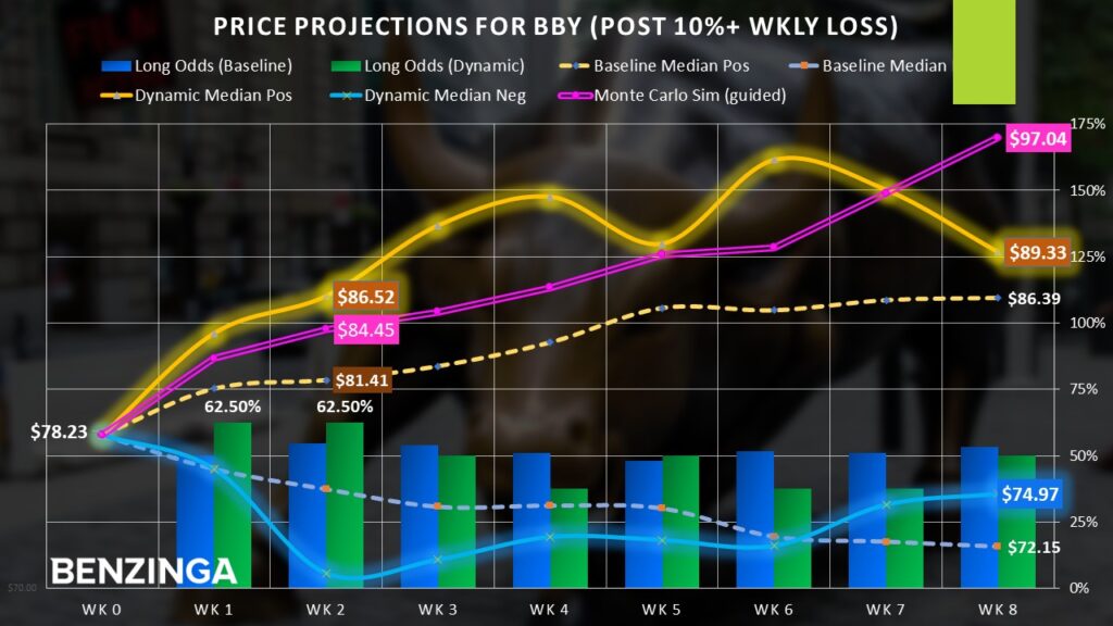 To use a musical analogy, it’s as if the notes on a composition were transposed up a whole step. That’s why even if the eight-week probabilities are 50/50, the overall winds still favor bullish speculation. Add in the fundamental likelihood that the Trump administration will potentially back down from tariff threats and Best Buy suddenly looks more enticing.