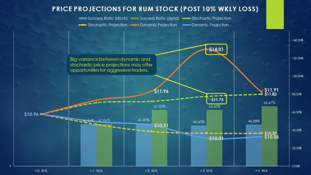 To be fair, applying conditional or dynamic probabilities dramatically limits the size of the dataset. Nevertheless, a clear trend can be established. Historically, whenever RUM stock lost any value for the week, the chances of the conclusion of the fourth subsequent week posting a positive return rises to 50.5%. For 5% losses or worse, the stats improve to 53.5%. Thus, the greater the loss, the greedier the market becomes.