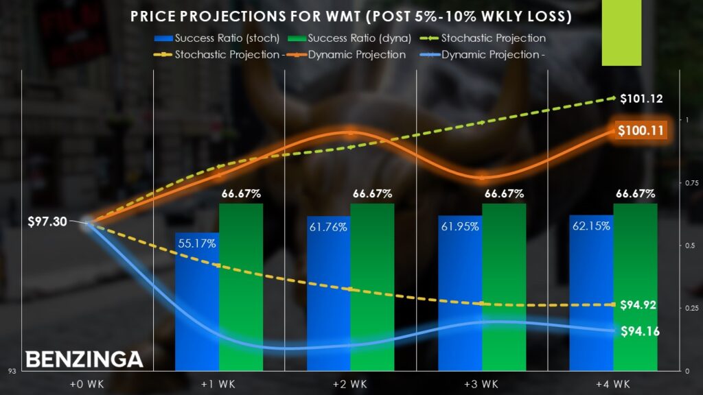 However, something interesting happens when Walmart stock encounters unusual volatility. For the current week, the security is on pace to lose more than 6%. Whenever Walmart incurs a one-week loss between 5% and 10%, the subsequent week sees long odds pop to nearly 67%. This stat stays consistent for the next four weeks, resulting in a median return (assuming the positive scenario) of 2.89%.