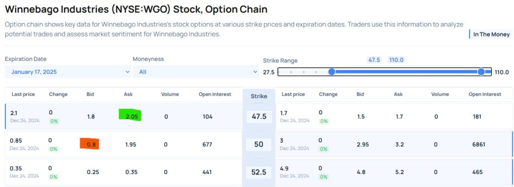 For WGO stock, the next available options chain expires on Jan. 17, 2025. Given the skepticism surrounding Winnebago’s business and comeback intentions, market makers are currently providing attractive pricing for bull call spreads.
