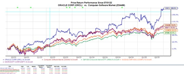 Following today’s rally, ORCL is up +30% in 2025. More impressive, Oracle stock is now sitting on +200% gains in the last three years to vastly outperform the broader indexes and its Zacks Computer-Software Market’s +95%, which includes Microsoft stock at +90%.