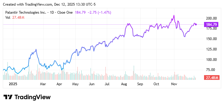 The chart shows PLTR regaining its uptrend after a brief shakeout, with the price back above the 50-day moving average near 180 and pushing toward prior highs. The 14-day RSI is in the low 60s, a zone that reflects strong but not yet “blow-off” momentum, leaving room for a continuation move into year-end rather than an obviously overbought setup. Volume has expanded on up days since late November, suggesting investors are buying dips rather than using strength to exit positions.