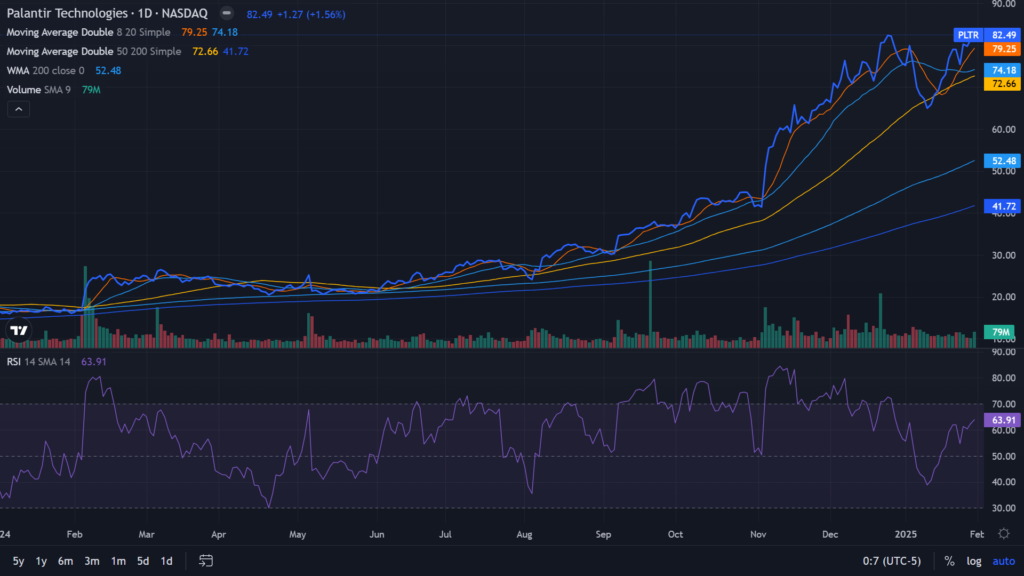 PLTR shares closed Friday at $82.49, significantly above its eight-day simple moving average of $79.25, and 20-day average at $74.18. Also, much above its 50 and 200-day averages of $72.66, and $41.72, respectively, according to Benzinga Pro. The relative strength index of 63.91, even though in the neutral zone, suggests the possibility of price correction in the near future.