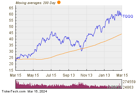 Looking at the chart above, TQQQ’s low point in its 52 week range is $22.72 per share, with $64.13 as the 52 week high point — that compares with a last trade of $58.31. Comparing the most recent share price to the 200 day moving average can also be a useful technical analysis technique — learn more about the 200 day moving average ».