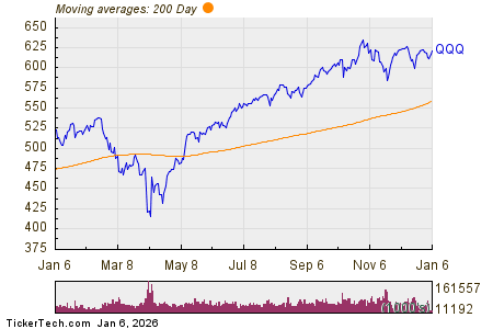 Looking at the chart above, QQQ’s low point in its 52 week range is $402.39 per share, with $637.01 as the 52 week high point — that compares with a last trade of $622.44. Comparing the most recent share price to the 200 day moving average can also be a useful technical analysis technique — learn more about the 200 day moving average ».