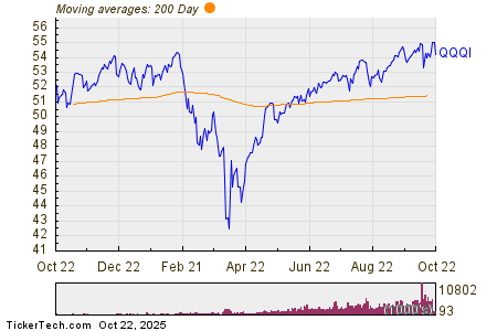Looking at the chart above, QQQI’s low point in its 52 week range is $41.1701 per share, with $55.18 as the 52 week high point — that compares with a last trade of $54.25. Comparing the most recent share price to the 200 day moving average can also be a useful technical analysis technique — learn more about the 200 day moving average ».
