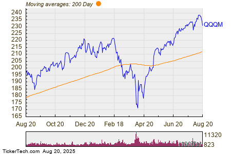 Looking at the chart above, QQQM’s low point in its 52 week range is $165.72 per share, with $240.11 as the 52 week high point — that compares with a last trade of $231.17. Comparing the most recent share price to the 200 day moving average can also be a useful technical analysis technique — learn more about the 200 day moving average ».